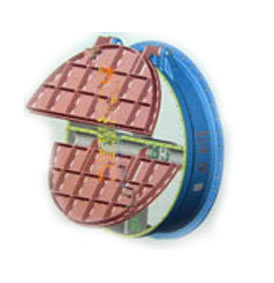 拍門適用于給排水及污水處置工程的各種管道和水渠道作溢流、止回之用,亦可用作各種豎井井蓋,它僅用于單向水流的圓形出水口構造特性,拍門具有流道正向單向開啟和反向關閉的作用。配重式拍門借助于配重的均衡作用,在水流的作用下使門頁自動開啟或關閉,或稍加外力作用使門頁開啟或關閉;浮箱式拍門則應用門頁在水中的浮力,在水流的作用下使門頁開啟或關閉。
